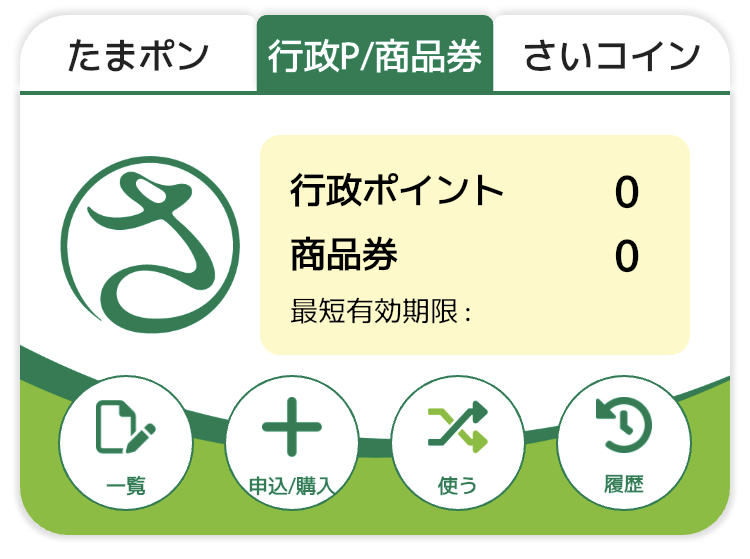 1.ホーム画面 「行政P/商品券」を選択・「申込/購入」をタップ2.「【さいたま市民限定】プレミアムデジタル商品券の申 込 は こち ら 」を タップ